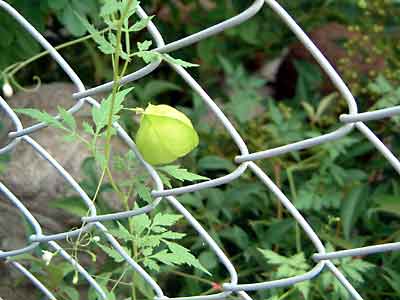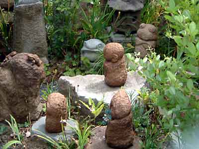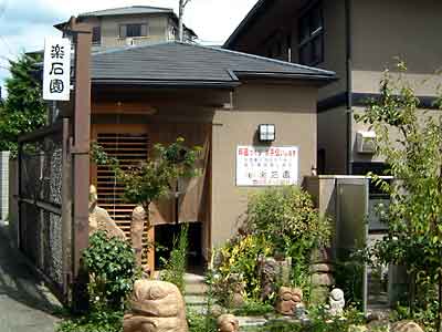 すぐ右手に「樂石園」(石材店)が見えてくる。商品?なのか、小さなおじぞうさんや石のオブジェがフェンス越しに見える。良く観察すると実に良くレイアウトされていて面白い。フェンスに絡まっている「ほうずき」もサイコ−にかわいい。