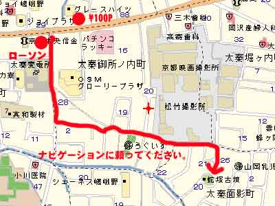 ひたすら三条通りを走っていくと右手に「ドラッグストアひかり」左手には「サークルK」が見えてくる。そこを越えてすぐのところを右折するのだが、ここが結構わかりにくく道が細い。できればナビゲーションを参考に右折してほしい。右折して左手に「ちょうちん屋」が見えれば正解である。
