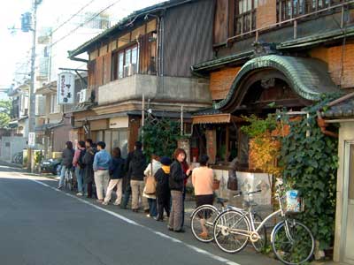 ロケーションは、西陣の北方、 町屋がまだ沢山残っている住宅地の中にひっそりとお店がある。 わらび餅を注文すると目の前で切って箱詰めしてくれ、売り切れ御免。